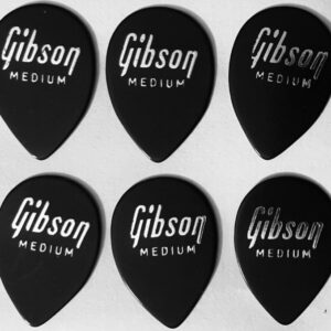 Vintage Gibson Guitar picks (6) Teardrops Thin Gauge from the 1979/1980 Black celluloid foil-Embossed old Gibson logo