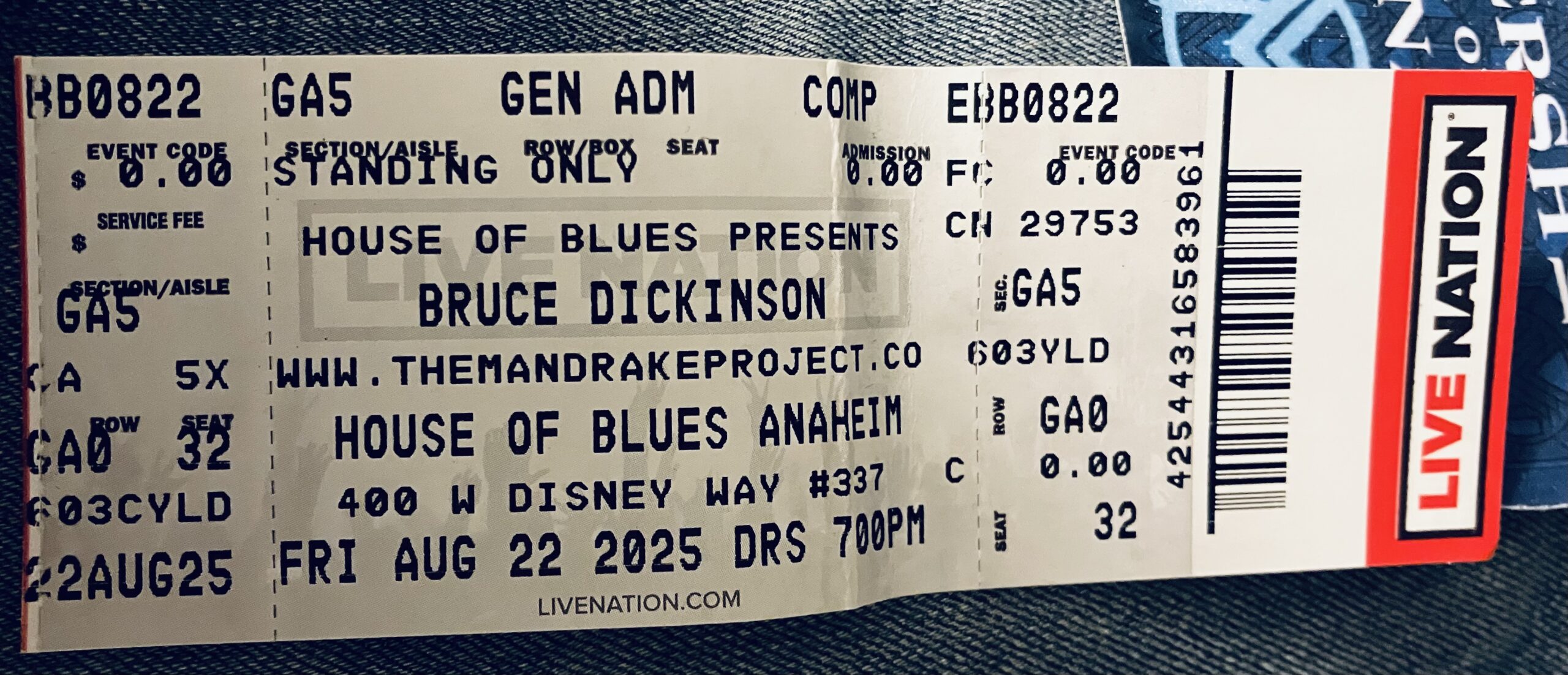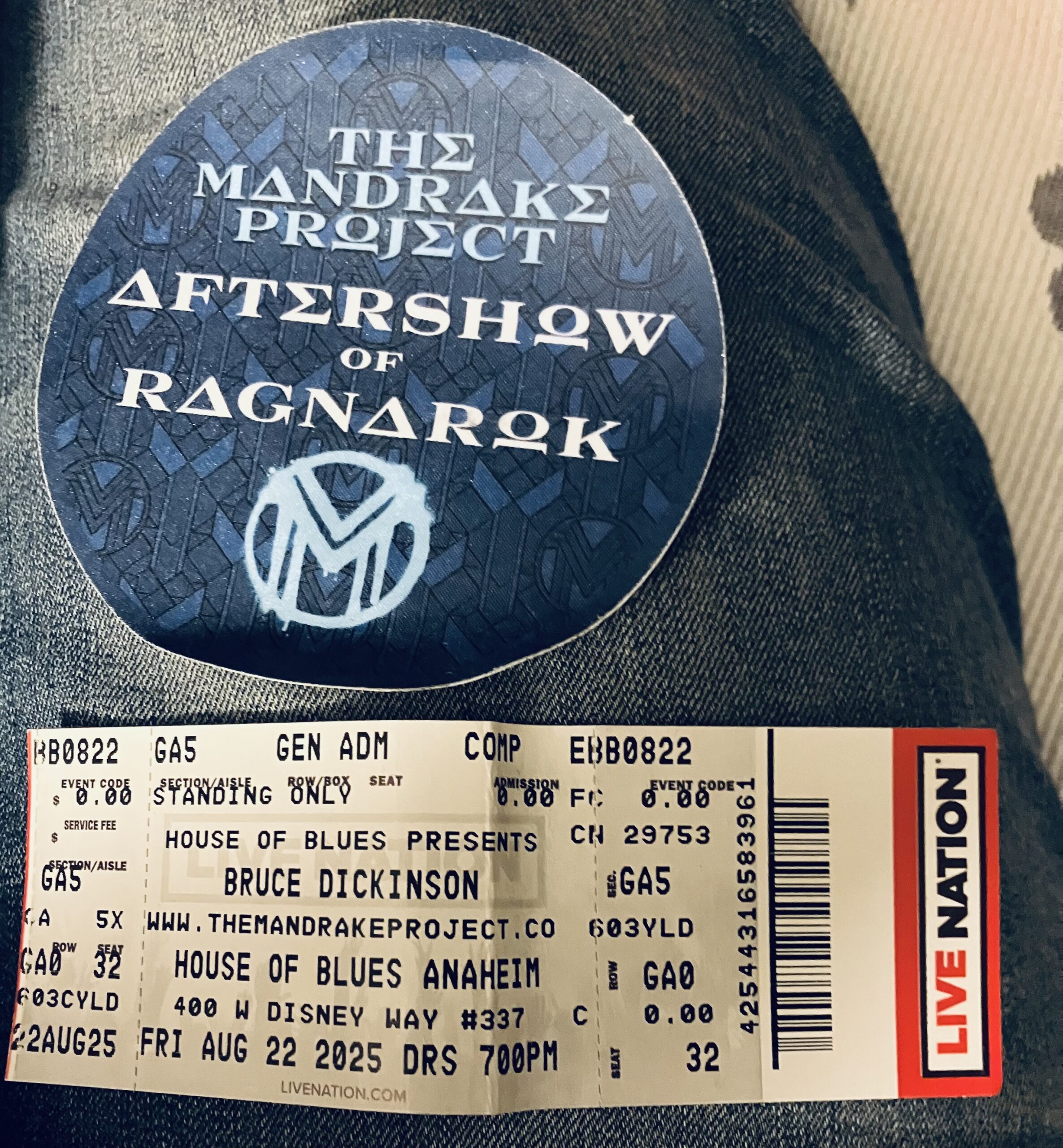 Bruce Dickinson The Mandrake Project 8/25/2025 House of Blues-Anaheim Ticket-stub + Aftershow Badge Sticker