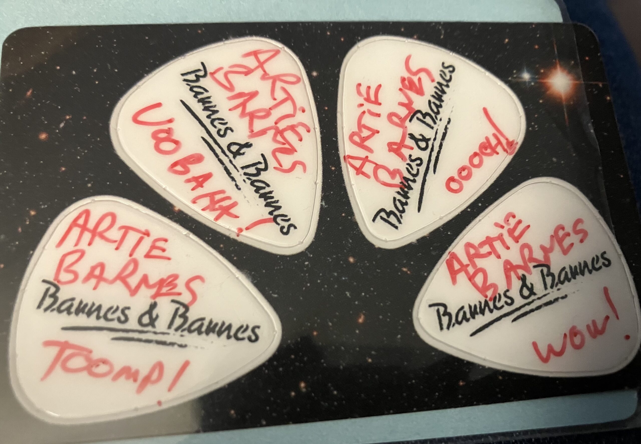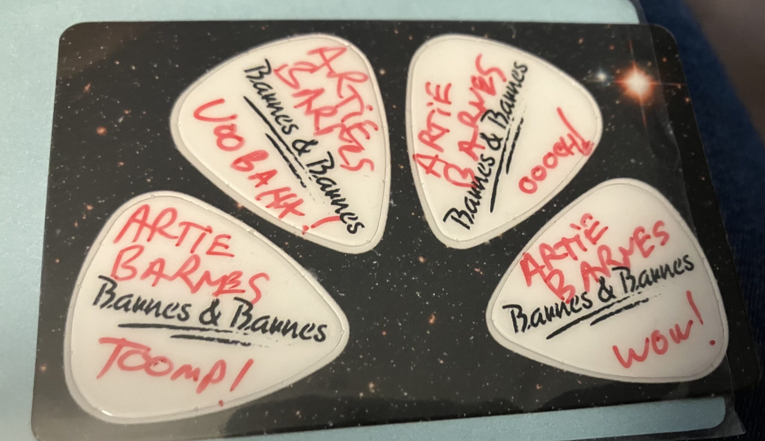 Dr Dimento Radio Show’s Artie Barnes Barnes & Barnes Guitar Picks (4) Pick Card from Robert Haimer, the brilliance behind the song “Fish Heads” very RARE!
