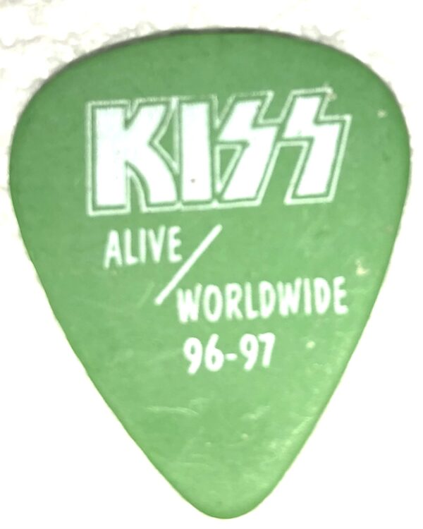 KISS Guitar Pick stage-used by Peter Criss on the “96 – 97 ALIVE WORLDWIDE TOUR” 1996-1997 Green/White Signature