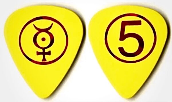Marilyn Manson logo on the front page of the pick, 5 on the back. Bright Yellow with metallic red-foil embossing.