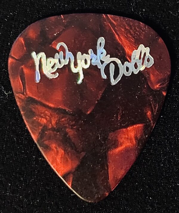 New York Dolls Guitar Pick pearloid-Ruby-Red pick with prism-embossed silver-logo, one-sided “vintage” (Unknown origin)