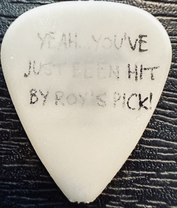 Saliva Guitar Pick stage-used during early show on 2001 Every Six Seconds Tour “saliva cuz Lori Rocks/Yeah… you’ve just been hit by Roy’s Pick” (pick made by D’Andrea)