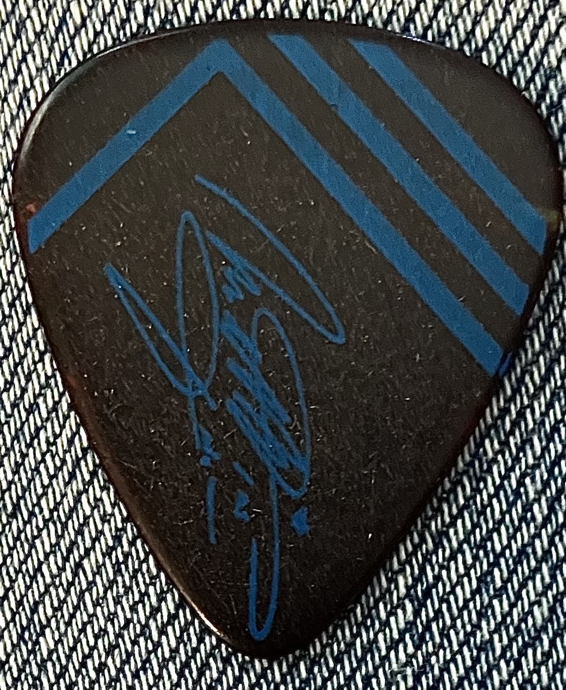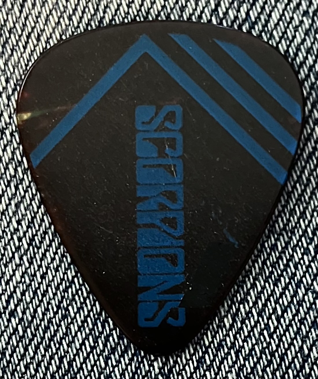 Scorpions Guitar Pick stage-used by Lead Guitarist Matthias Jabs at a show on the 2001 Acoustica Tour, heavy faux-tortoise pick/blue print