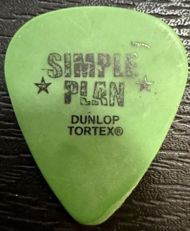 Simple Plan Guitar Pick stage-used by Jeff Stinco during 2012 Tour Crab Art, signs of use/audience-caught