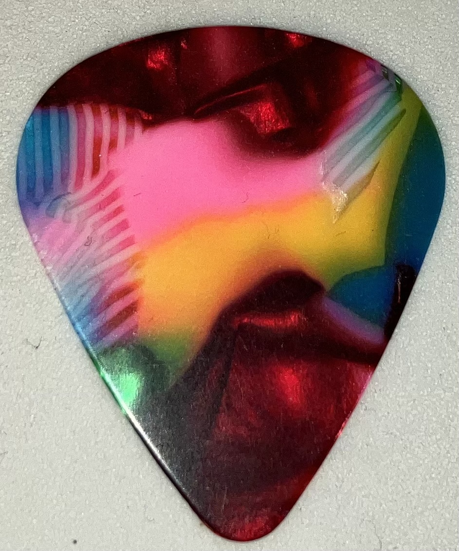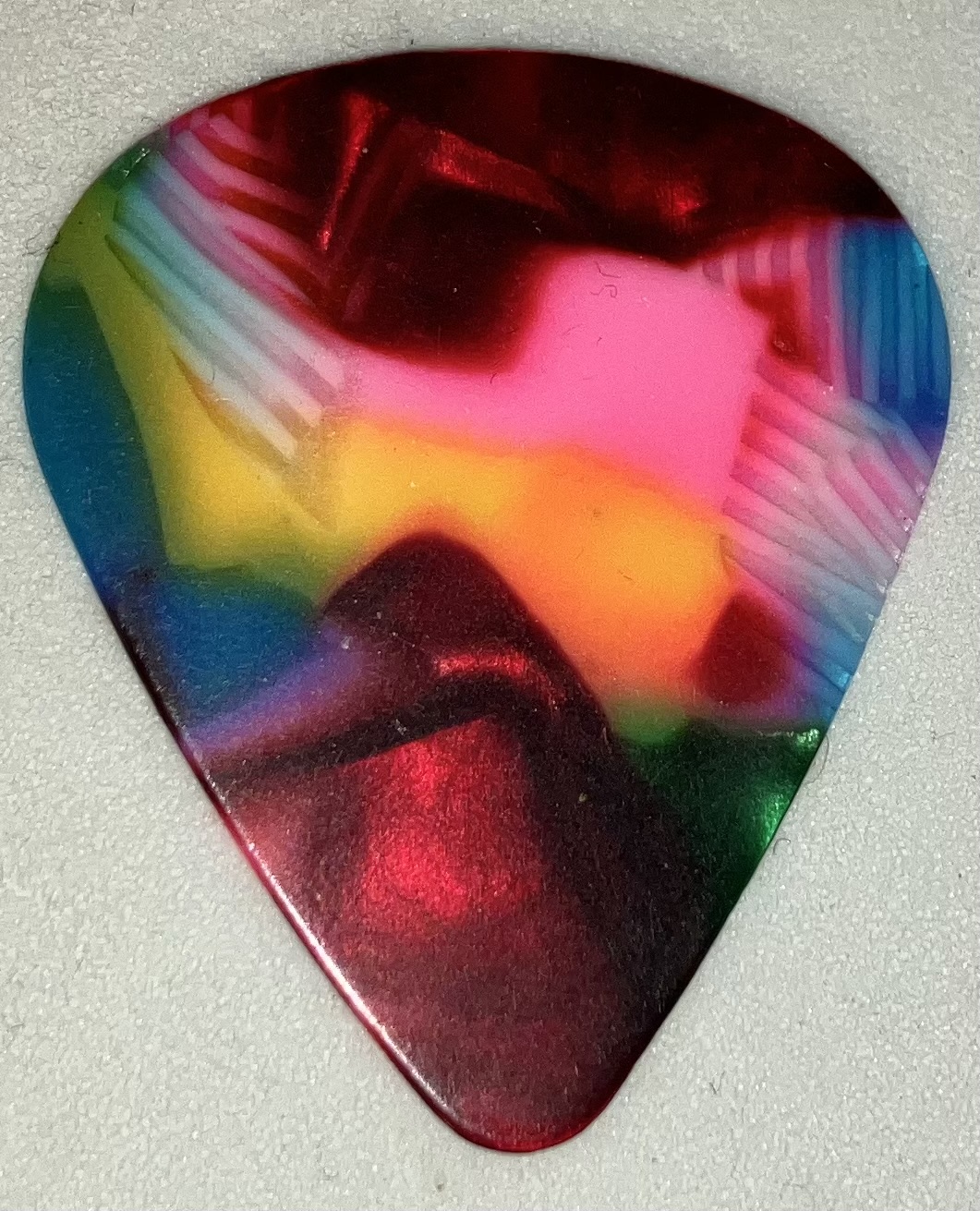 #167 Vintage 1980s Mosaic Guitar Pick “One of a kind” gorgeous guitar pick with deeply saturated colors in iridescent pearl coloring vibrant colors emerald green/Ruby blood red/orange/blue/pink with lace! Thin gauge #167